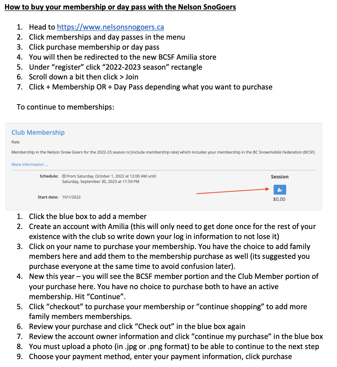 To purchase your memberships or day passes with the Nelson SnoGoers please click the tab below to be redirected to the British Columbia Snowmobile Federation Amilia Smart Rec store website: